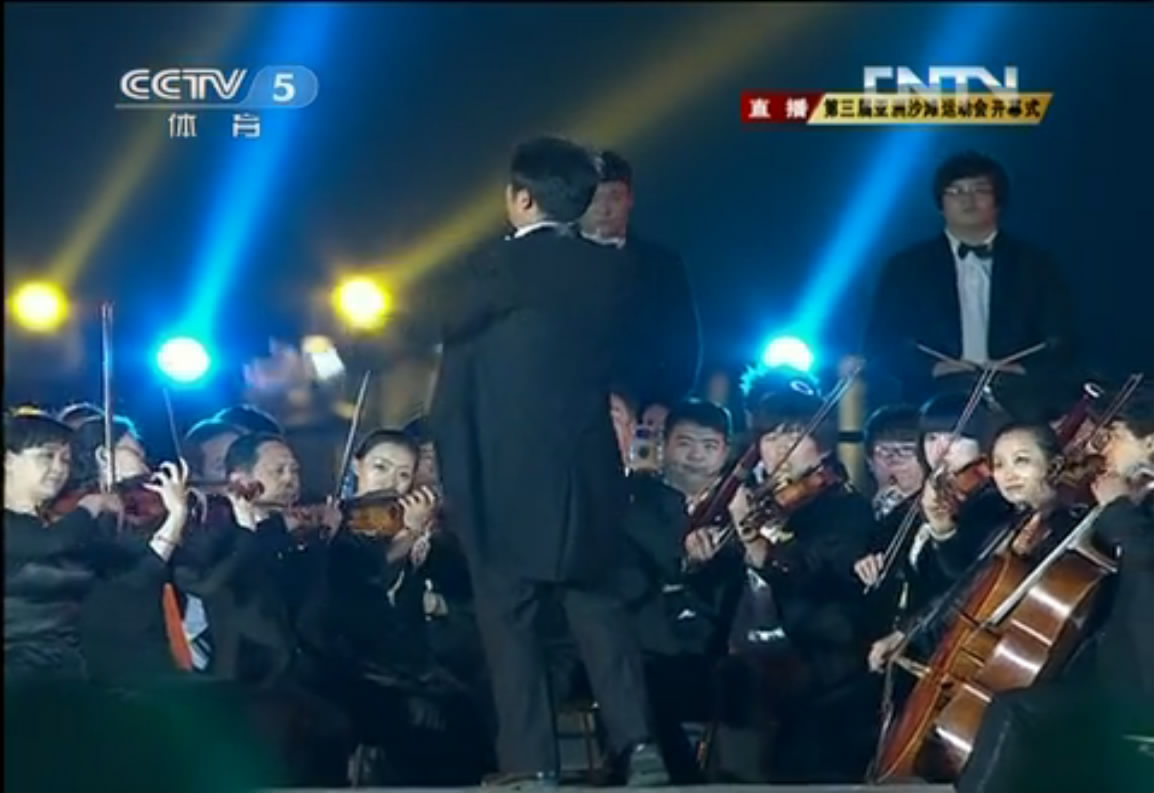 海阳亚沙会是中国继北京奥运会、广州亚运会和深圳大运会之后举办的又一个令人瞩目的国际体育盛会,也是中国第一次由县级城市举办的洲际比赛。开幕式上进行了名为“碧海金沙的交响”文艺演出,演绎了“海韵、阳光、激情、时尚”的理念。整场演出以“大海与金沙的交响、运动与时尚的和谐”为主线,分“金沙梦想、大海欢歌、激情飞扬、快乐相聚”四个篇章。最后,歌手曹芙嘉高唱第三届亚沙会主题曲《快乐在一起》,在欢快的旋律中文艺演出落下帷幕。主要由公司师生组成的交响乐团承担了开幕式序曲《碧海金沙的交响》的现场演奏,广受好评。