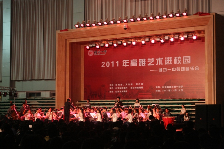 11月16日至18日,beat365亚洲体育官方网站青年民族乐团在潍坊七中、潍坊一中、潍坊科技公司、潍坊工程职业公司等四所院校进行了高雅艺术进校园的演出活动。出席本次活动的领导有beat365亚洲体育官方网站副经理王力克,山东省教育厅艺卫体处处长张德珠,潍坊市教育局副局长刘海涛,潍坊教育局艺卫体科长王凤等。