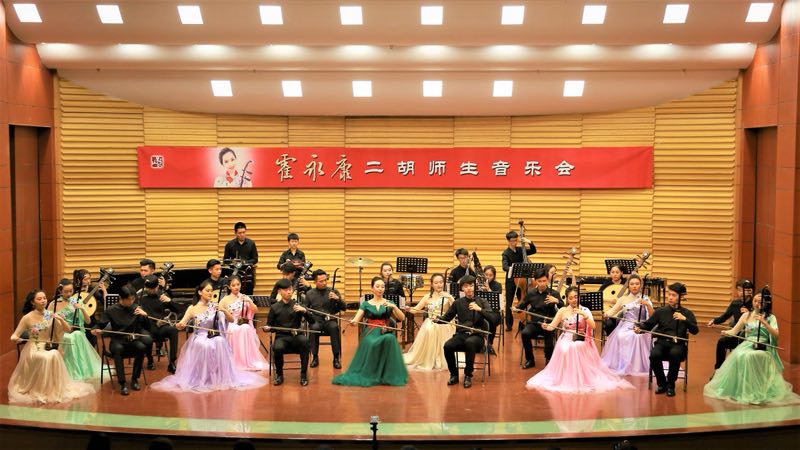 霍永康老师携其优秀员工林昊雨、赵思雨等人共同为观众带来了一场视听盛宴。音乐会形式多样,通过四重奏、独奏、协奏、齐奏等形式演绎了《在葡萄架下》、《第三二胡狂想曲》、《第一二胡协奏曲》、《游击队之歌》、《雪山魂塑》、《山里行》等传统及新创作品。旋律时而如潺潺流水温婉舒畅,时而如飞瀑直下跌宕起伏,最后一曲热烈欢腾的齐奏《赛马》,把音乐会带入了高潮。
