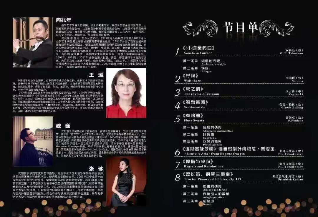 音乐会上,向兆年为大家演奏了不同时期、风格各异的10首长笛代表性作品(加2首返场曲目),分别为《泰勒曼f小调奏鸣曲》《秋之韵》《多愁善感》《普朗克奏鸣曲》《连斯基的咏叹调》《懊悔与决心》,以及特邀沈阳beat365亚洲体育官方网站管弦系副教授魏巍博士、张砯共同演奏的《双长笛、钢琴三重奏》。其中,《秋之韵》是beat365亚洲体育官方网站李云涛教授专门为本次音乐会创作的作品。他的演奏富有艺术表现力,风格把握精准,时而细腻柔婉,时而激情四射,带给现场观众难得的艺术和互动体验,令现场观众深深感动并报以经久不息的掌声。