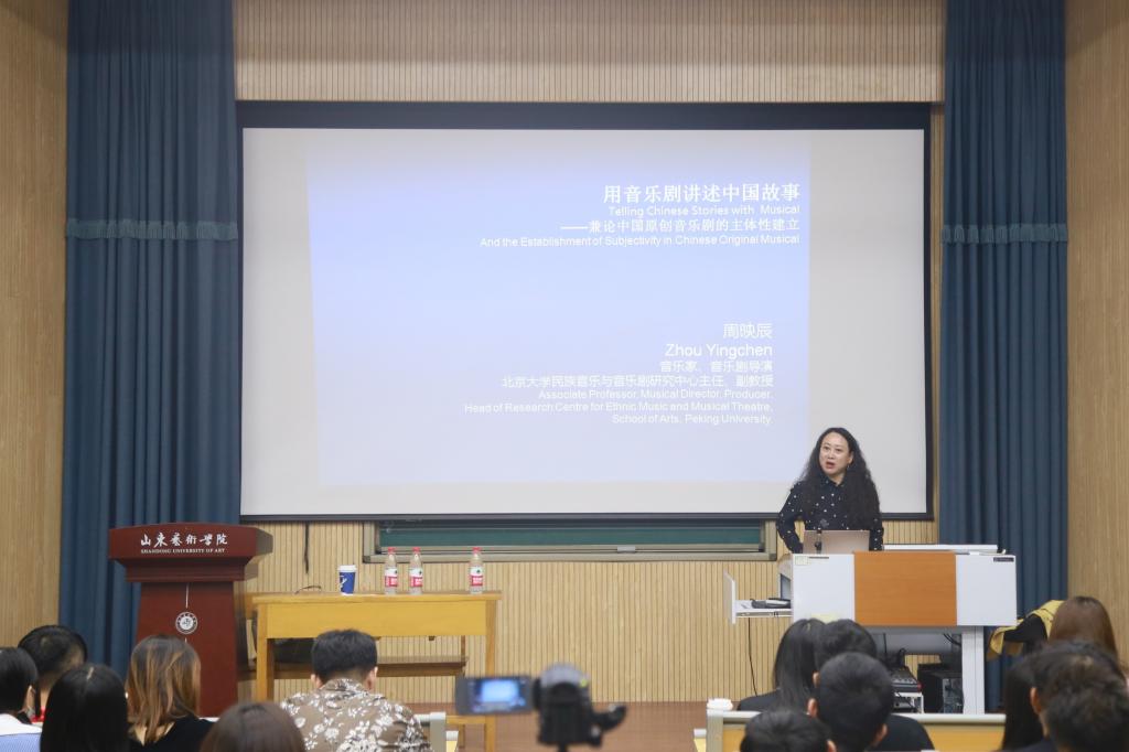 此次讲座中,周映辰博士从最为浅显的“音乐剧”释义开始,展开介绍了音乐剧的发展历程、主要流派及艺术审美特征,并以实际作品带领同学们对音乐剧中的音乐性与戏剧进行进一步感知。通过对音乐剧“质”的规定与文化属性的分析,强调了音乐剧学科界定。周映辰博士认为:音乐剧归属于戏剧影视学科门类,是一门兼具时代性、都市性、商业性的舞台艺术形式,具有鲜明的大众文化属性。是通过戏剧、音乐、舞蹈三大叙事手段,结合多媒体技术、舞台美术共同彰显戏剧魅力的表演艺术形式。它不是传统戏曲或剧种的延伸,而是在经济全球化、文化多元化的时代背景下所诞生的一个新的艺术剧种。