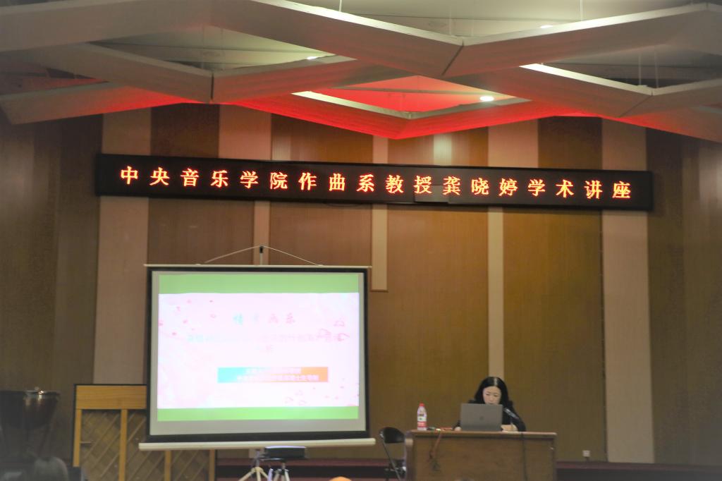 讲座中,龚晓婷以近年创作的交响音画《悬浮的什刹海》为例,分成六个板块进行分析总结。当《悬浮的什刹海》音乐响起,我们的脑海中渐渐浮现出那美丽的风景,一幅幅场景深深吸引着我们,让我们兴致高涨。龚晓婷主要分析了“音色与音响对意境的刻画”,她从作品中截取富有特点的片段分别进行分析,其中英国管的使用独具特色,给予作品忧郁的气质,呈现出一幅朦胧优雅的印象派绘画意境。龚晓婷又从“民族风格与西洋乐器的巧妙融合”中深入分析,京胡与木管组乐器巧妙融合,相辅相成,使音乐更加出彩,起到画龙点睛的作用,带给听众浓浓的亲切感。龚晓婷认为,作曲家要从现实入手,产生联想,使我们可知可感,同时要敢于尝试,用音乐表达美、表达情感,创作出独具特色的作品。此次讲座,让同学们了解了创作美学与技法的关联,培养了自身的审美认知及获取了创作美学发展的新动态,使同学们受益匪浅。