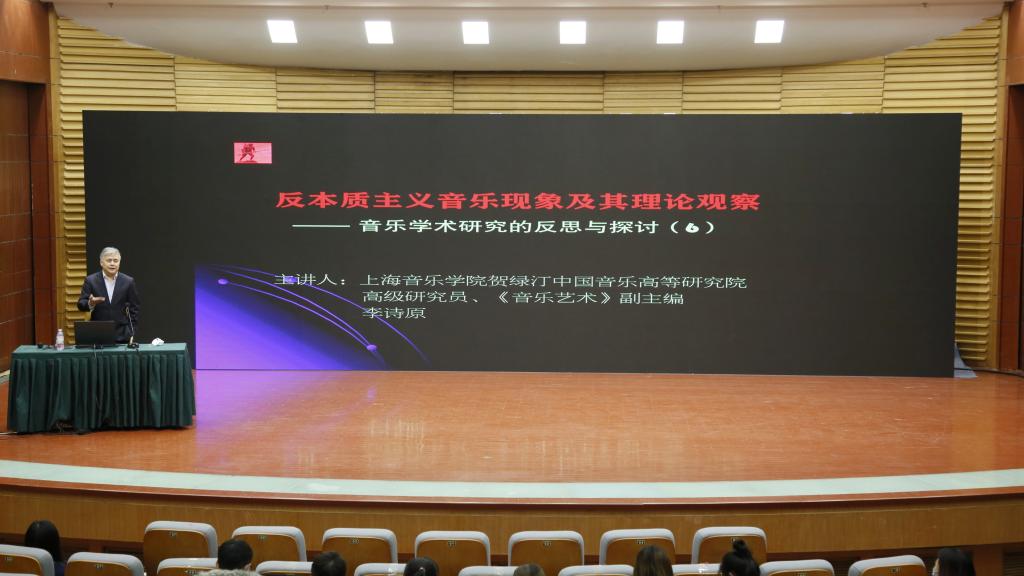 讲座中,李诗原教授以生动幽默的话语,分别从解题、解词、举例、总结四个方面系统讲述了什么是反本质主义音乐现象,并分别举了三个不同方面的例子,让我们更好的,更直观的理解了这个比较抽象的概念。其中李诗原教授还提出了在面对旨在解构理论、挑战理论、重建理论的反本质主义音乐现象时的解决办法:一方面应坚持本质主义的知识建构和认识论模式,并在坚持本质求证前提下作出坚持和妥协;另一方面则应打破本质主义与反本质主义的二元对立,既将知识建构作为理论的原点和归宿,又要承认概念与它指陈的对象之间存在差异,并从本体论、认识论转向价值论,作出一种基于实用理性和人文主义的肯定。