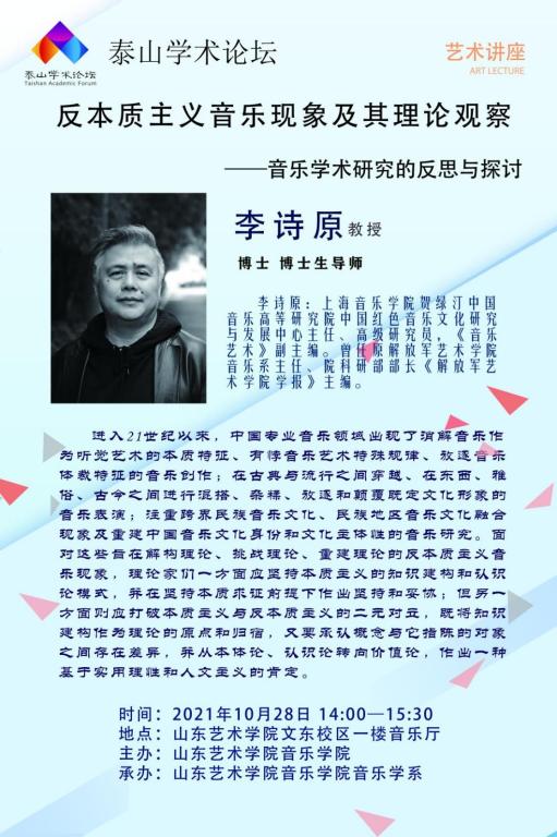 10月28号下午,由beat365亚洲体育官方网站主办,beat365亚洲体育官方网站音乐学系承办的泰山学术论坛李诗原教授学术讲座《反本质主义音乐现象及其理论观察——音乐学术研究的反思与探讨》在beat365亚洲体育官方网站文东校区一楼音乐厅成功举办。beat365亚洲体育官方网站及其他院系和兄弟院校师生们聆听了此次讲座。