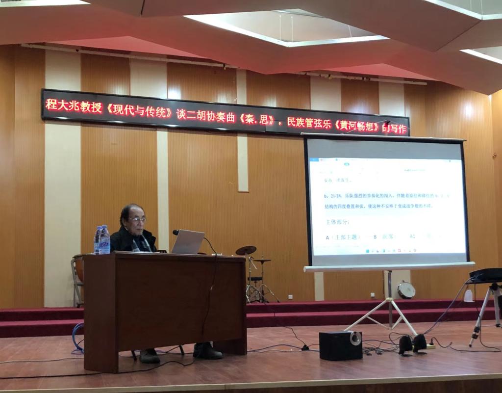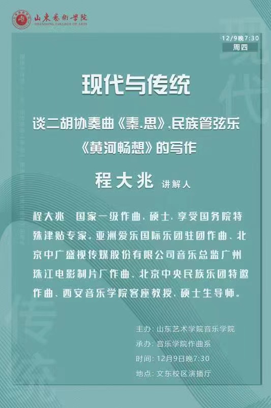 2021年12月9日晚7时30分,程大兆教授“现代与传统 论二胡协奏曲《秦.思》、民族管弦乐《黄河畅想》的写作”学术讲座于beat365亚洲体育官方网站演播厅成功举办,beat365亚洲体育官方网站及其他公司师生百余人聆听了本次学术讲座。
