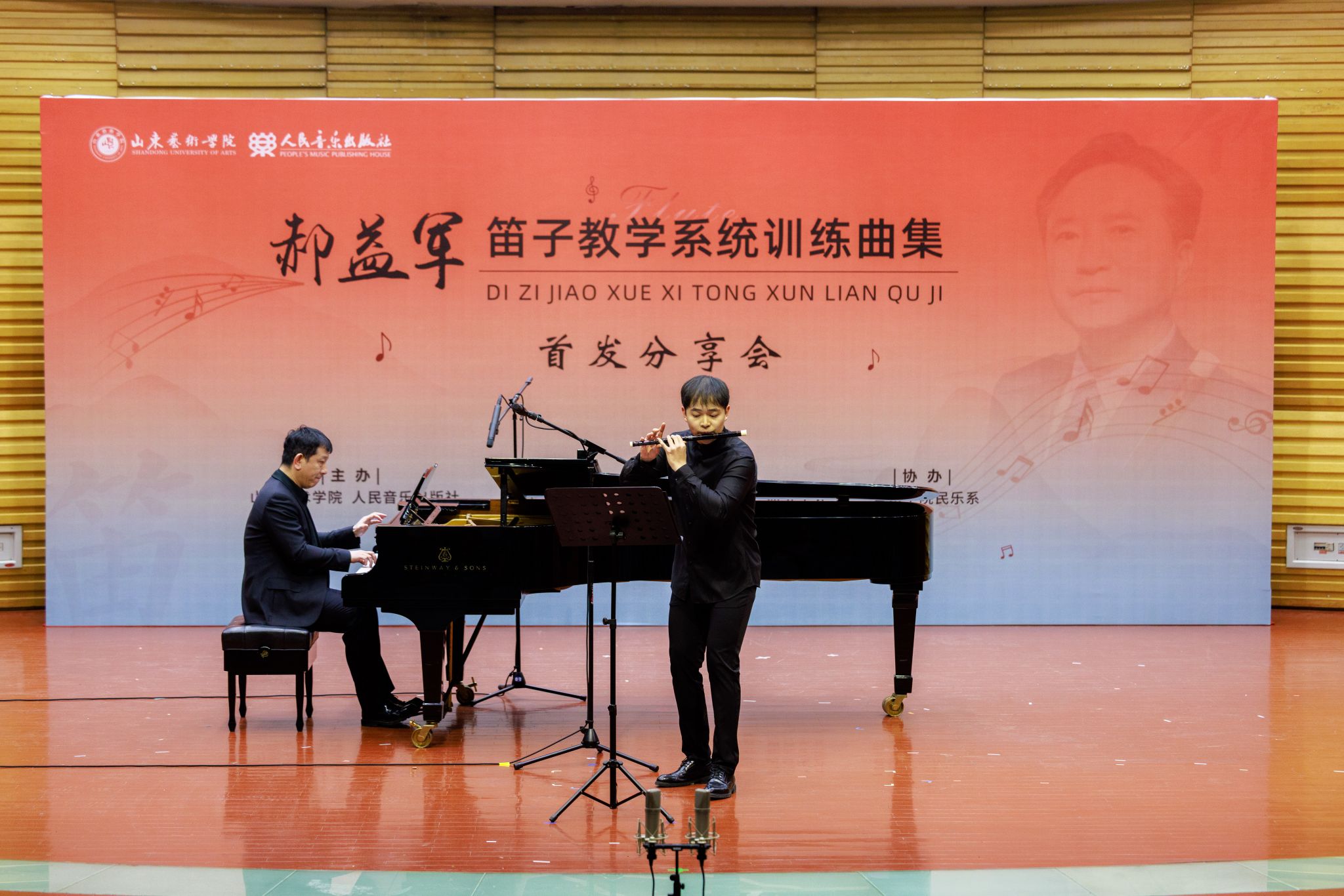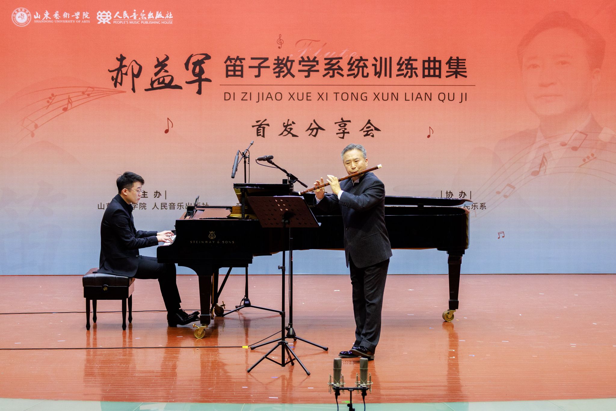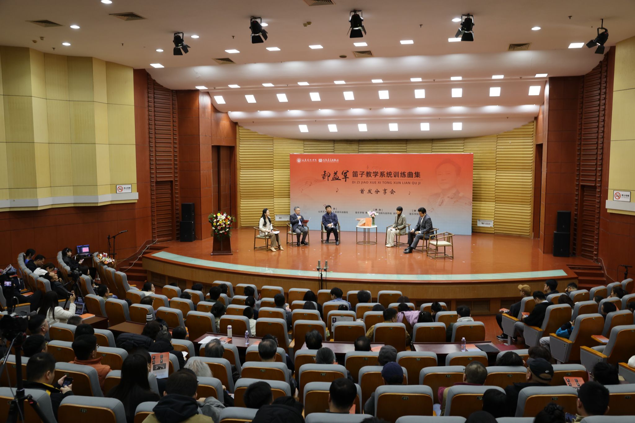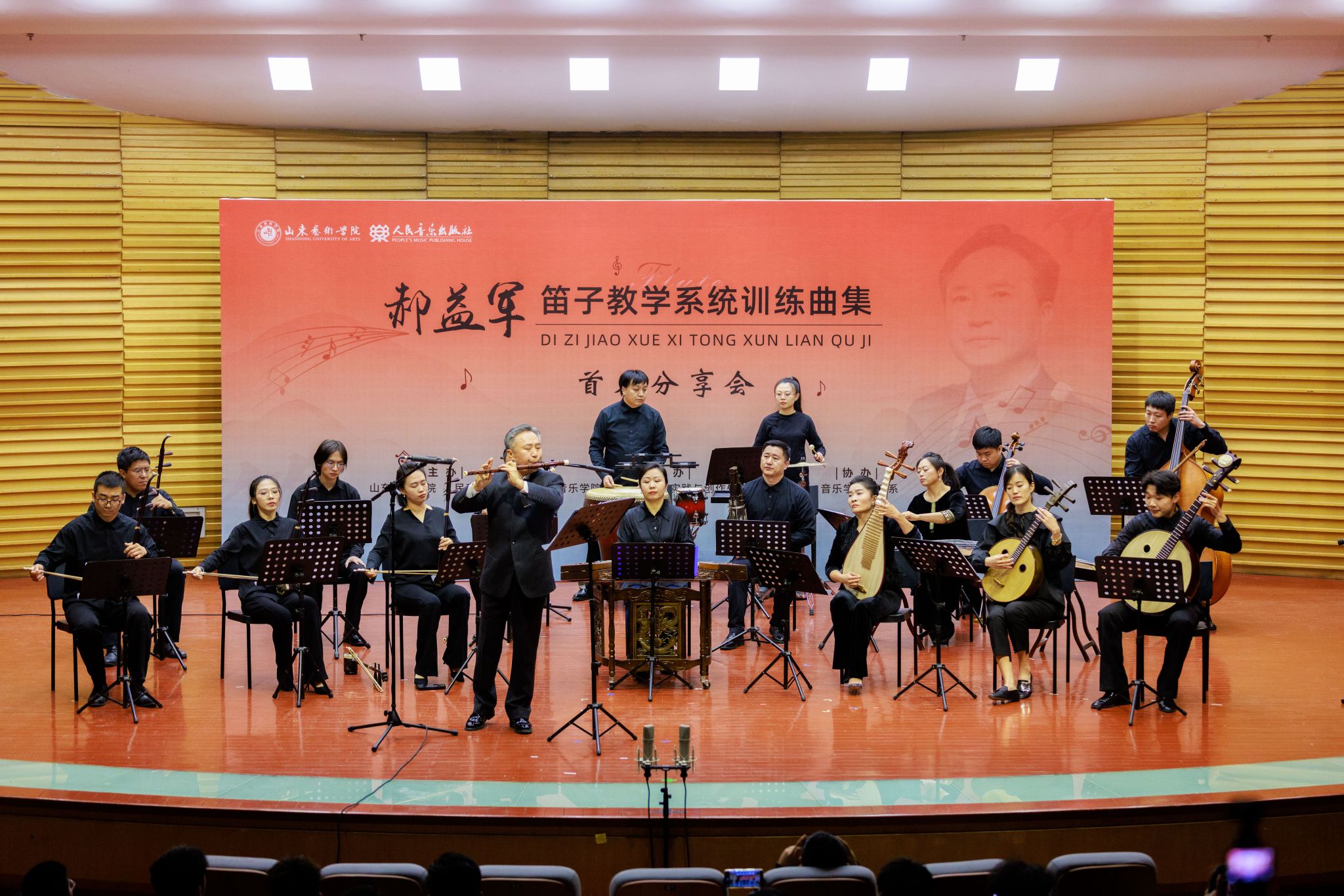 2025年3月29日下午,beat365亚洲体育官方网站郝益军教授最新编著教材《笛子教学系统训练曲集》首发分享会在山艺音乐厅举行。人民音乐出版社副总编辑李向颖,人民音乐出版社第二编辑部主任刘滢,中国民族管弦乐学会党支部书记、中国广播艺术团原团长王书伟,中国民族管弦乐学会党支部副书记、国标委考级标准委员会委员田龙,中国竹笛学会副会长、江苏竹笛学会会长、江苏民族乐团一级演奏员王键,山东省音协主席、beat365亚洲体育官方网站经理王歌群,beat365亚洲体育官方网站艺术实践与创作处处长朱长磊等嘉宾,与来自全国多所高校竹笛专业人士、beat365亚洲体育官方网站师生及社会各界音乐爱好者三百余人齐聚一堂,共同见证这一学术盛事。