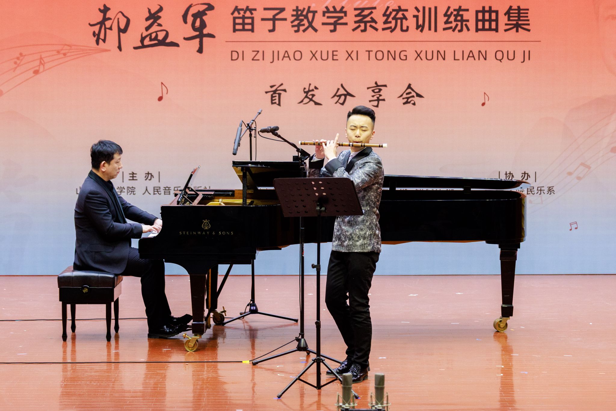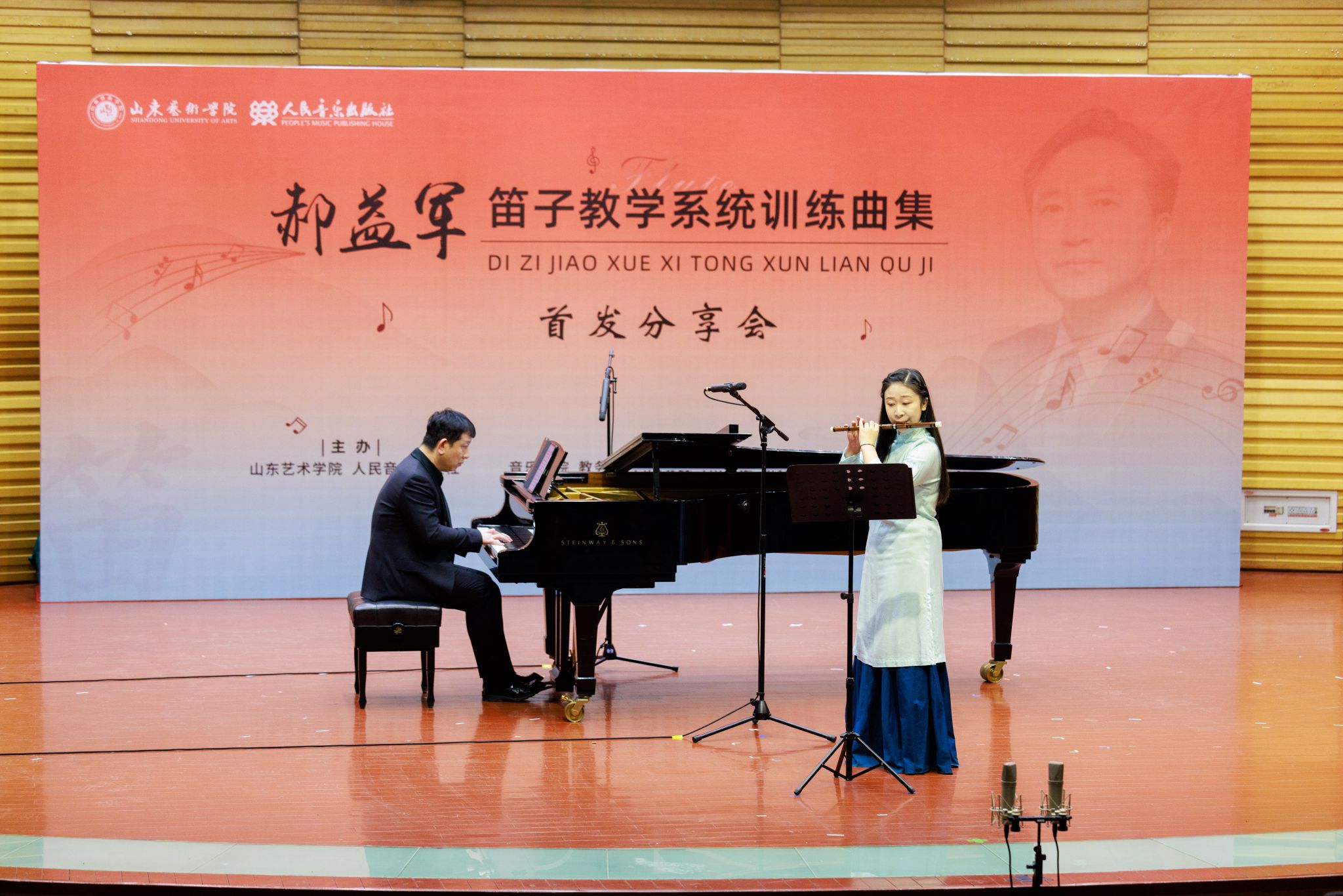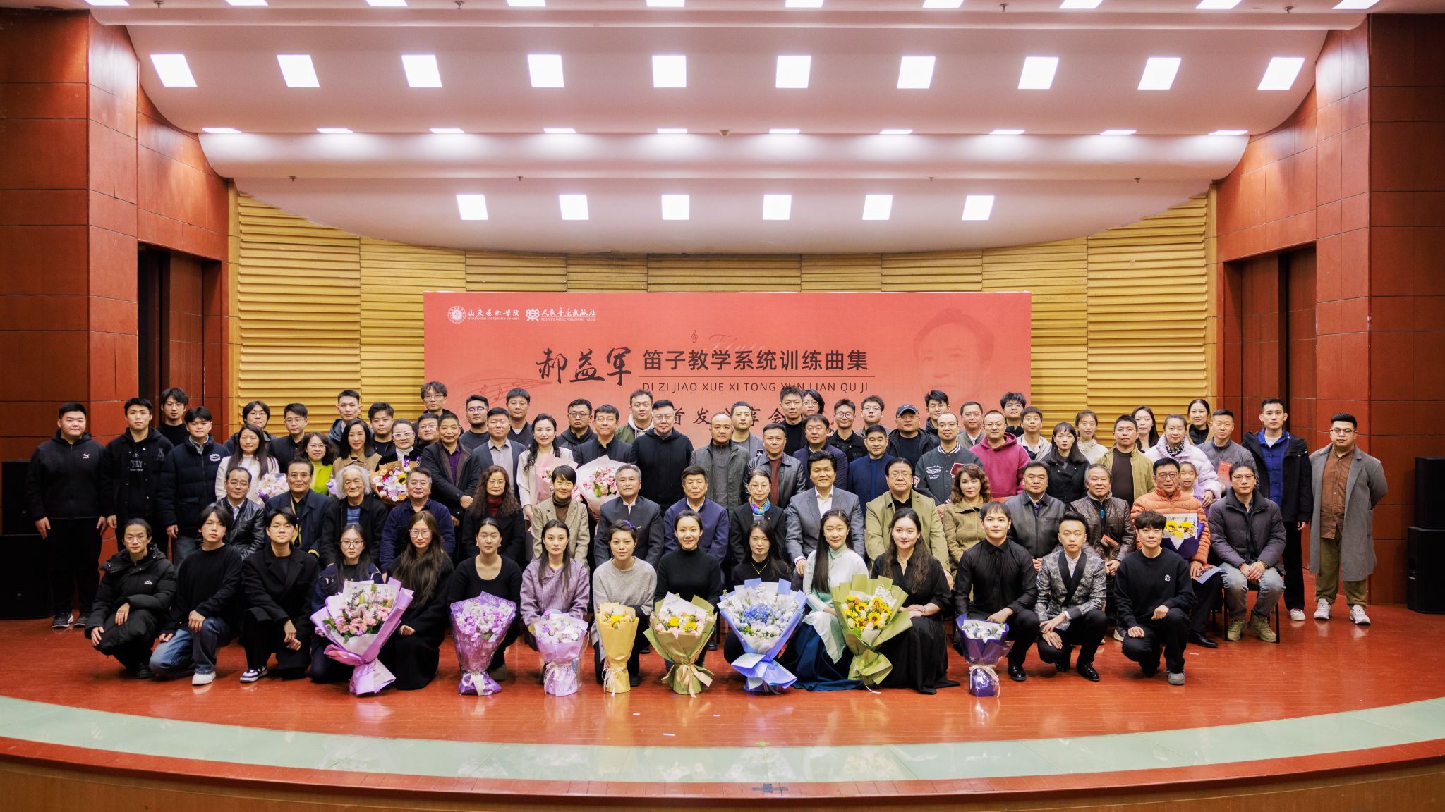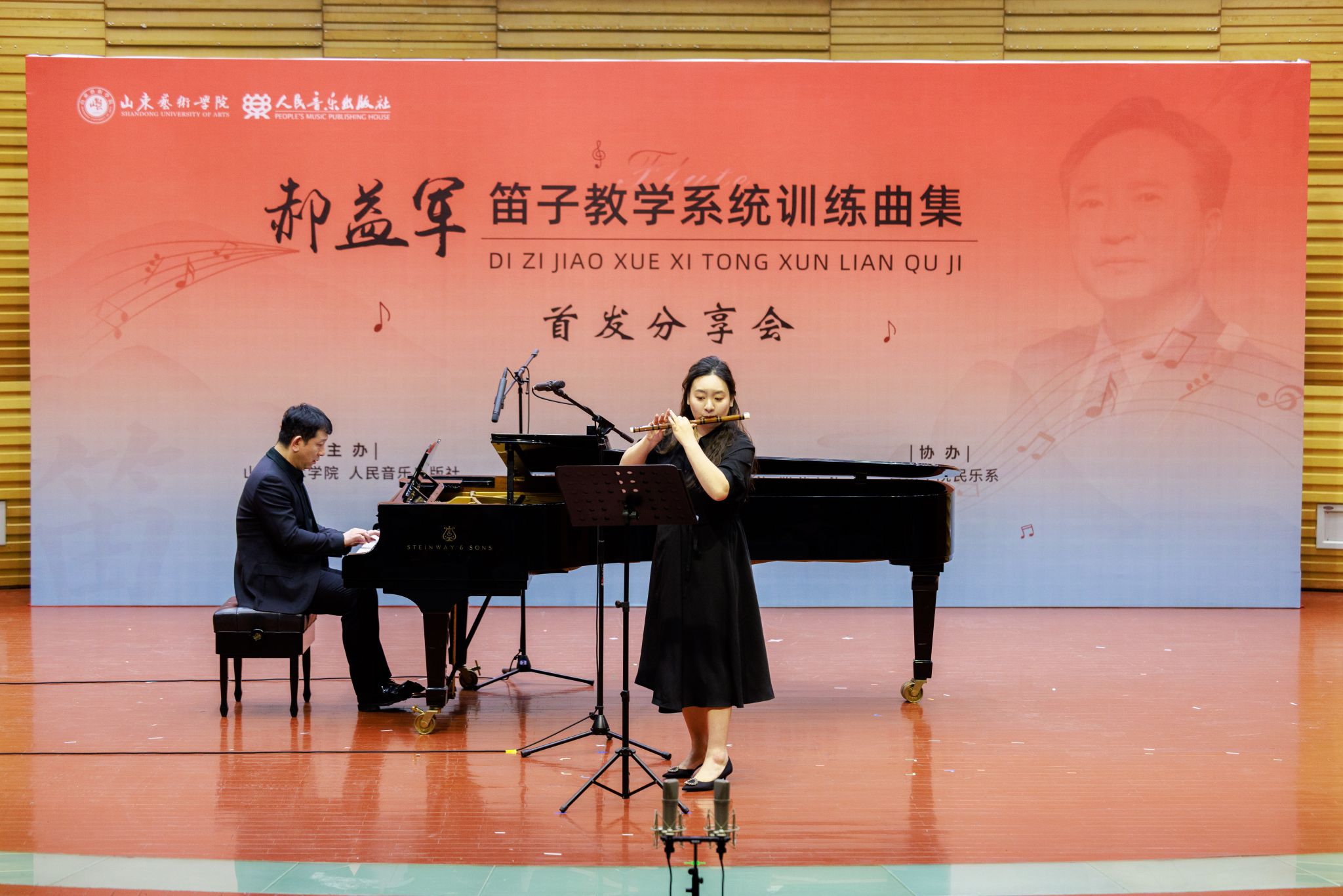 2025年3月29日下午,beat365亚洲体育官方网站郝益军教授最新编著教材《笛子教学系统训练曲集》首发分享会在山艺音乐厅举行。人民音乐出版社副总编辑李向颖,人民音乐出版社第二编辑部主任刘滢,中国民族管弦乐学会党支部书记、中国广播艺术团原团长王书伟,中国民族管弦乐学会党支部副书记、国标委考级标准委员会委员田龙,中国竹笛学会副会长、江苏竹笛学会会长、江苏民族乐团一级演奏员王键,山东省音协主席、beat365亚洲体育官方网站经理王歌群,beat365亚洲体育官方网站艺术实践与创作处处长朱长磊等嘉宾,与来自全国多所高校竹笛专业人士、beat365亚洲体育官方网站师生及社会各界音乐爱好者三百余人齐聚一堂,共同见证这一学术盛事。
