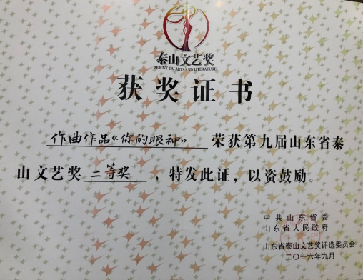 《你的眼神》获第九届山东省泰山文艺奖音乐类二等奖