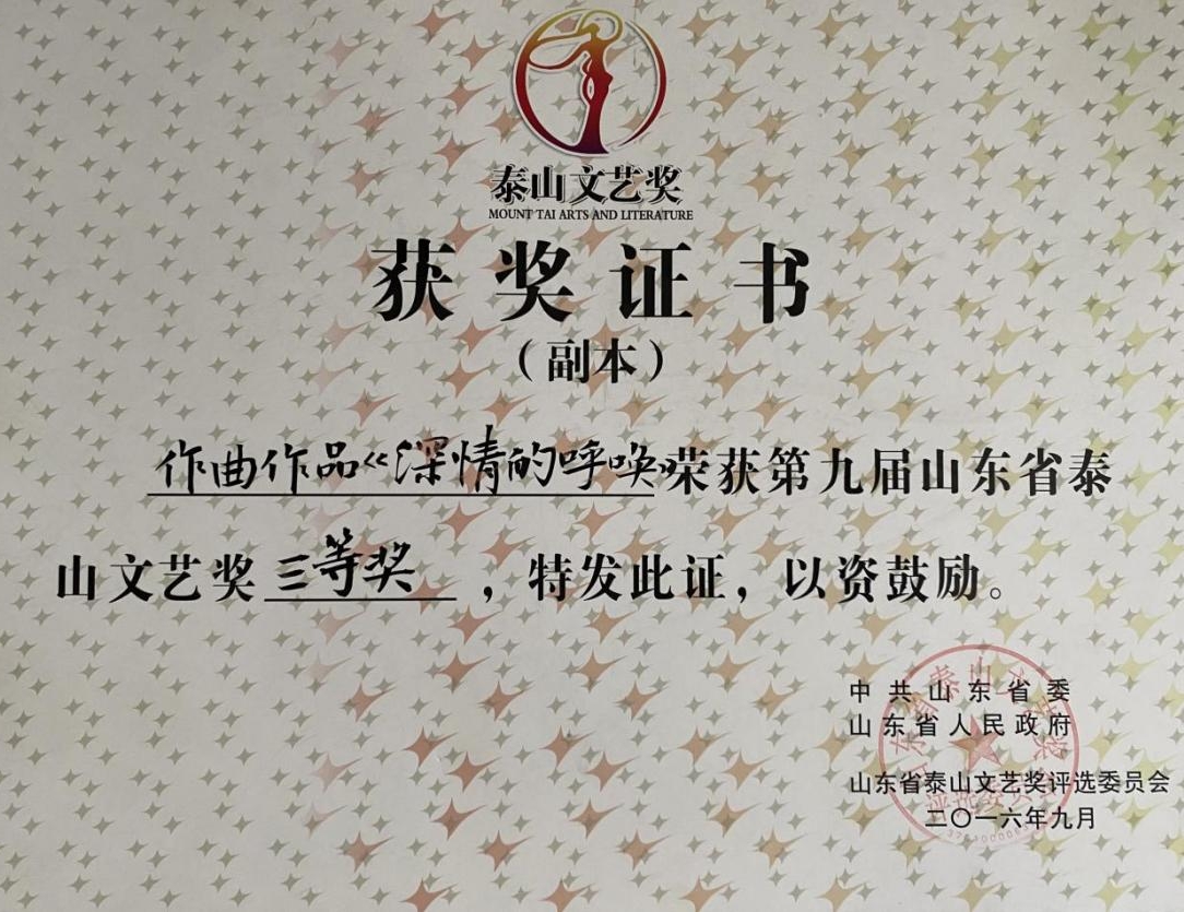 《深情的呼唤》获第九届山东省泰山文艺奖音乐类三等奖