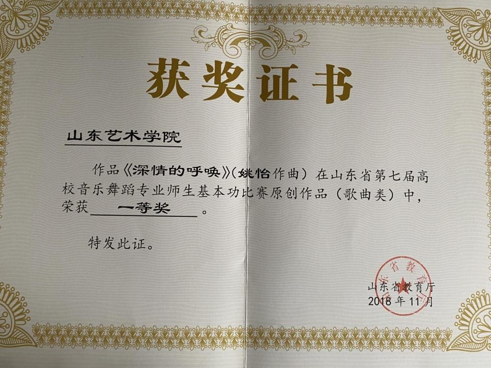 《深情的呼唤》获山东省第七届高校音乐舞蹈专业师生基本功比赛原创作品(歌曲类)一等奖