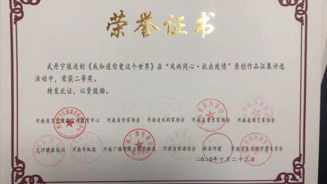 《我知道你爱这个世界》获“风雨同心 抗击疫情”原创作品征集二等奖
