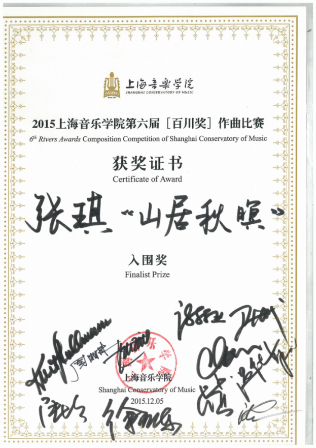 《山居秋暝》第六届"百川奖"作曲比赛入围奖
