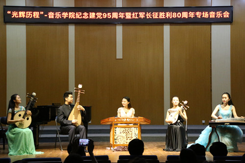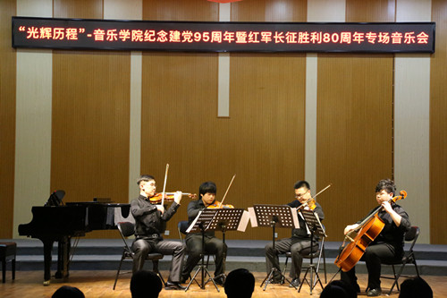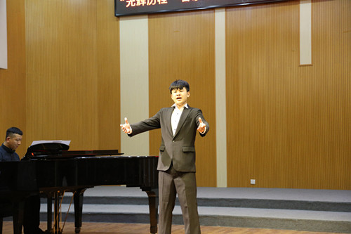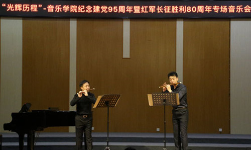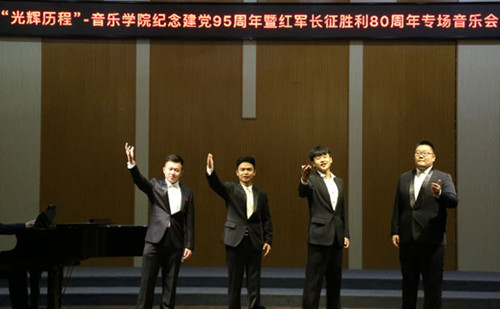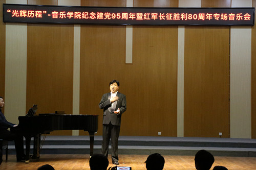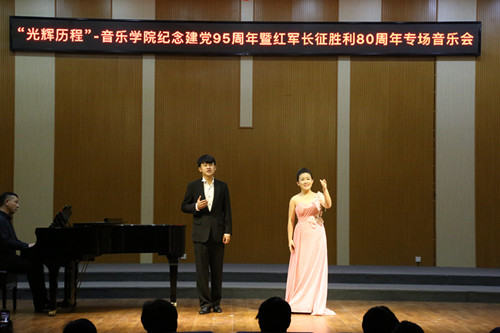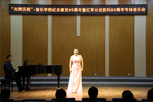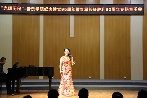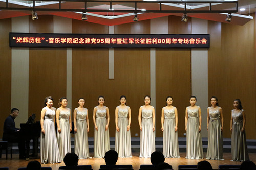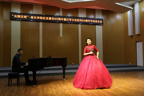 音乐会在一首女声独唱《江山》中拉开帷幕。随后,男生独唱《过雪山草地》—选自长征组歌(红军不怕远征难)带我们回顾了中国共产党带领中国人民走过的艰难历程和峥嵘岁月;大提琴独奏《萨丽哈最听毛主席的话》抒发了各族人民对祖国,对党的热爱之情;女声独唱《红梅赞》歌颂了以江姐为代表的革命党人追求光明的革命精神;男声四重唱《游击队歌》刻画出游击健儿机智、灵活的英雄形象;丝弦五重奏《红歌联奏》让大家在一首首耳熟能详的经典曲目中备受教育。女声独唱《阳光路上》把观众们带入一片光明的道路中;弦乐四重奏《情深意长》带领大家进入了红军从咱家乡过,红军是咱们的亲兄弟,长征不怕路途遥的年代。男声独唱《啊,中国的土地》表达出对祖国深邃而又炙热的情感;男女声二重唱《我的心和中国梦最近》一句“五星红旗是我的胎记,镰刀铁锤是我的自信”唱出了对党的无限忠诚;男声独唱《共和国之恋》表达了对祖国的赞美之情;女声小合唱《唱支山歌给党听》,歌颂了对党的无限热爱与感激之情;笛子二重奏《拥军秧歌》展现了军民的鱼水之情。最后音乐会在声乐教师党员《歌曲联唱》中圆满结束。