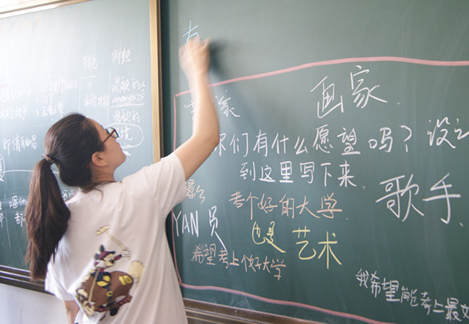 在高中部的教室,与听觉障碍的高年级孩子用手机打字交流,志愿者们在黑板上写出“你的愿望是什么?写到这里来吧。”的字样,