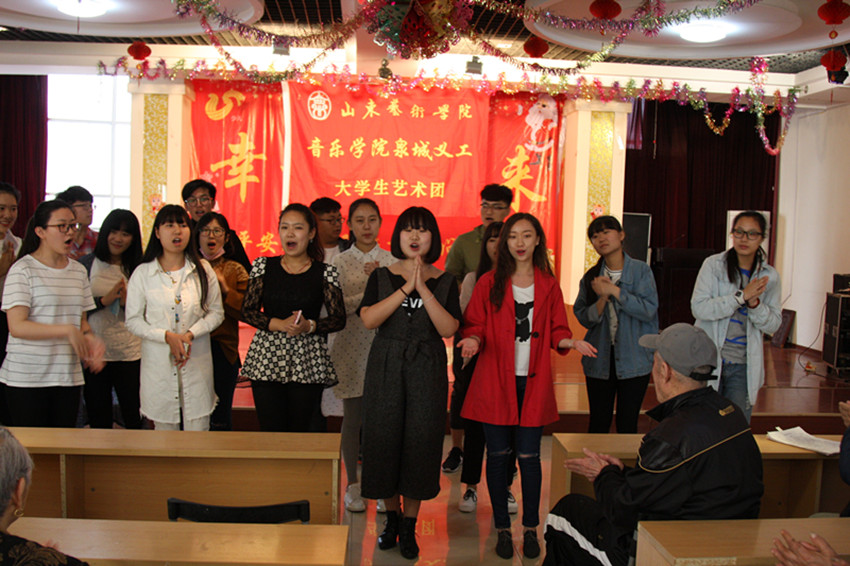 山歌、海笑、花飞扬,莺吟、燕舞、草清香。为学习贯彻习近平总书记系列重要讲话精神,将习近平总书记系列重要讲话内化为青年的精神追求,外化为青年的自觉行动,培养团员青年在老员工中领导思想政治正风向,积极响应校团委在全校团学组织中开展的“两学一做一争”活动的号召,beat365亚洲体育官方网站“泉城义工”老员工艺术团于4月16日来到了济南市风合家人老年公寓,在红情绿意的春日为老人们带去精彩的节目和真挚的祝福。